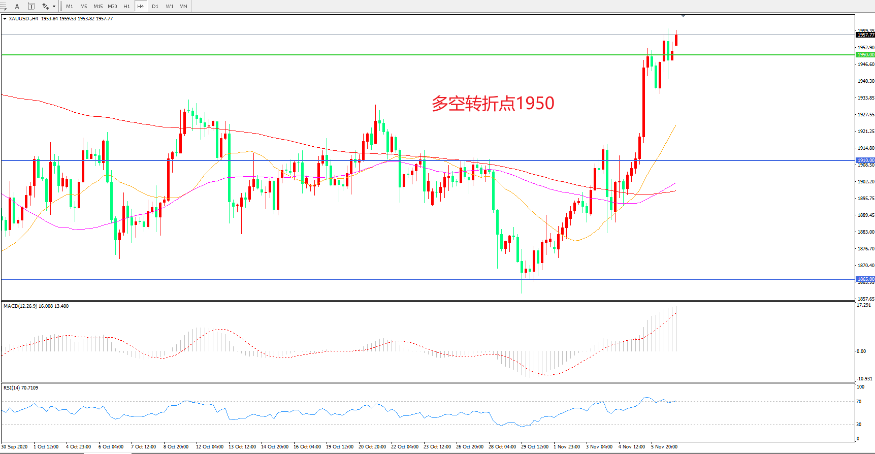 4小时图看,金价自低位长阳连续拉升,整体表现偏强, 1950成为多空分水岭, MACD红柱增加,RSI指标走平,日内延续上行概率较大。