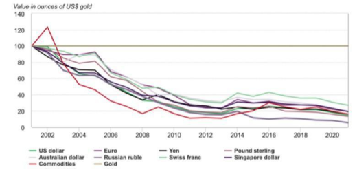 下图显示的是2002年-2020年,美元、欧元、日本等一系列货币相对于黄金的价值比据世界黄金协会还称,通胀是大型机构投资者关注黄金的原因。该协会表示,物价上涨的压力已经在伤害消费者。