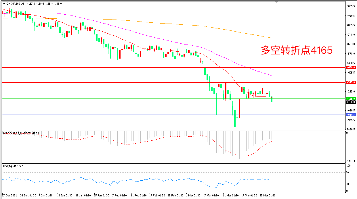4小时图看,沪深300以4165为依托展开整理,窄幅震荡继续明显, MACD绿柱缩短,RSI指标走平,日内震荡下行概率较大。
