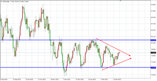 日线图显示,美原油目前进入三角形整理,下方低点上移同时上方高点下移,形成对称三角形收敛,预示着行情进入方向选择,同时随着价格走至末端,方向即将明确,若上破79美元上方看至82美元,若下破76美元,后市看至73美元附近。