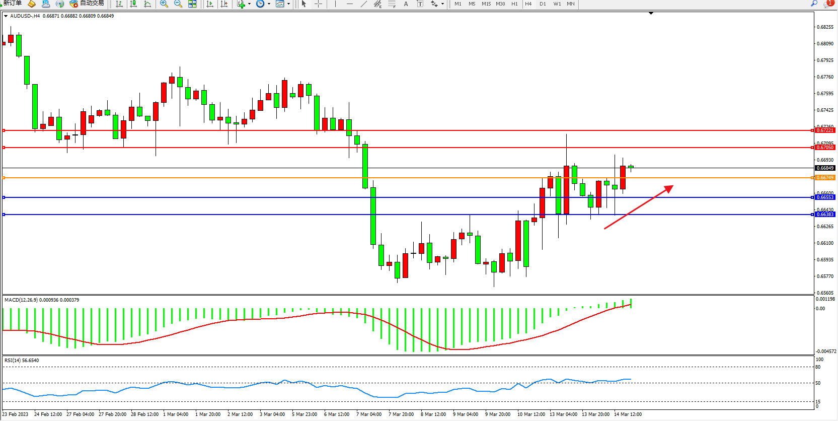 备选策略:0.66749上方看涨,目标0.67050  0.67221