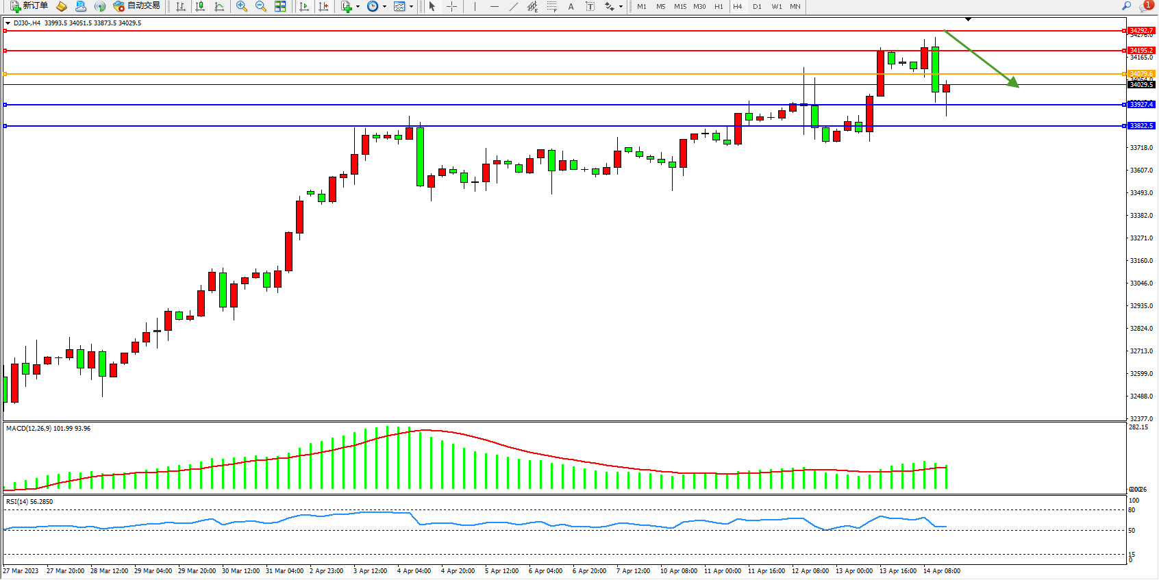 道琼斯指数DJ30——4小时K线图显示: