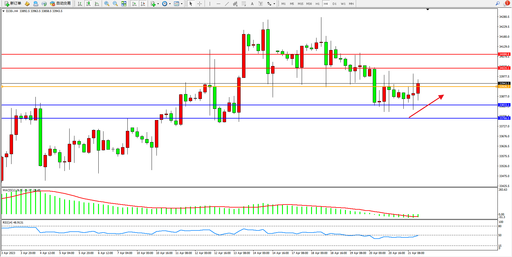 道琼斯指数DJ30——4小时K线图显示: